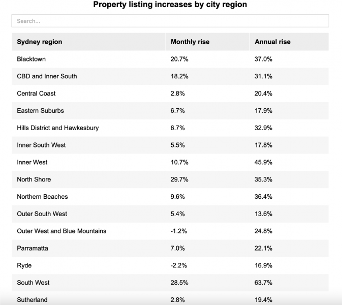 内西区的挂牌量猛增45.9%,Blacktown和北滩的增幅约为37%。