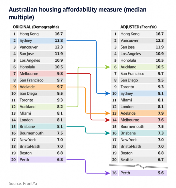 金融公司FrontYa对悉尼住宅价格(而非独立屋价格)中位数与家庭收入中位数的比率进行了修订,使悉尼的房价收入比从Demographia报告所称的13.8倍降至9.1倍。