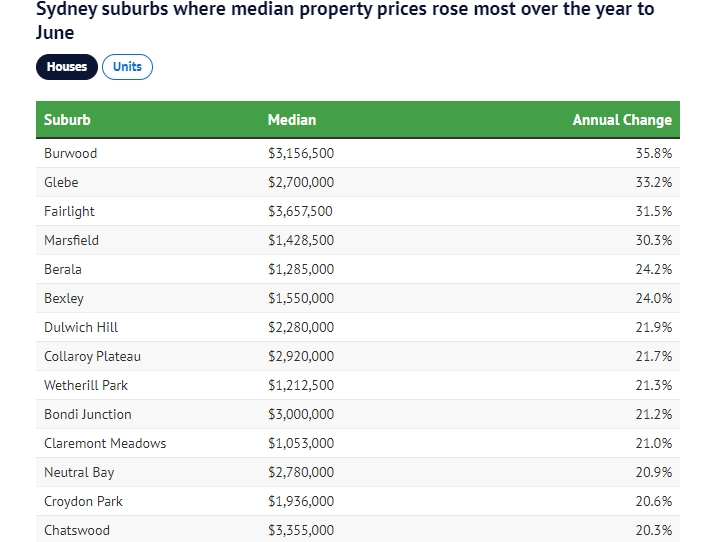 截至今年6月的12个月里,Burwood、Glebe和Fairlight的独立屋价格上涨30%以上,中位价分别达到近316万、270万和366万澳元.