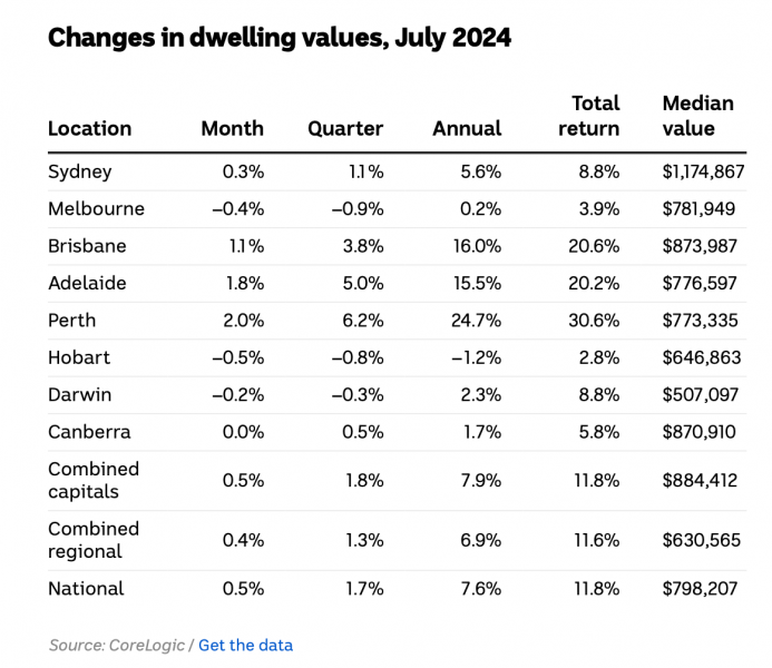 7月平均住宅价格攀升0.5%,这是房价连续第18个月上涨,住宅价格中位数为$798,207。三个城市逆势下跌,墨尔本在截至6月的季度内下跌0.9%,与霍巴特(-0.8%)和达尔文(-0.3%)并列。