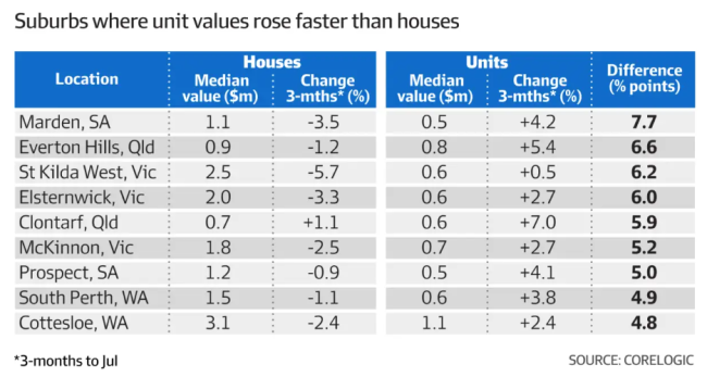在布里斯班,Everton Hills、Clontarf和Redcliffe的公寓价格上涨速度是独立屋的五倍多;在阿德莱德,Marden、Pooraka和Payneham的公寓价格增长率比独立屋高出七倍多。