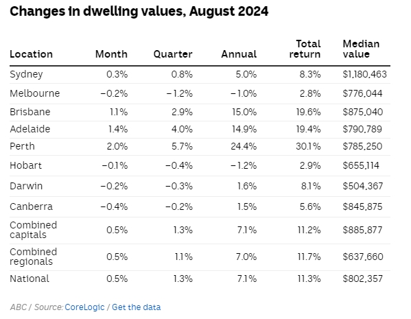 悉尼的房价依然最高,包括独立屋和公寓在内的中位房价为1,180,463澳元,较7月上涨0.3%。