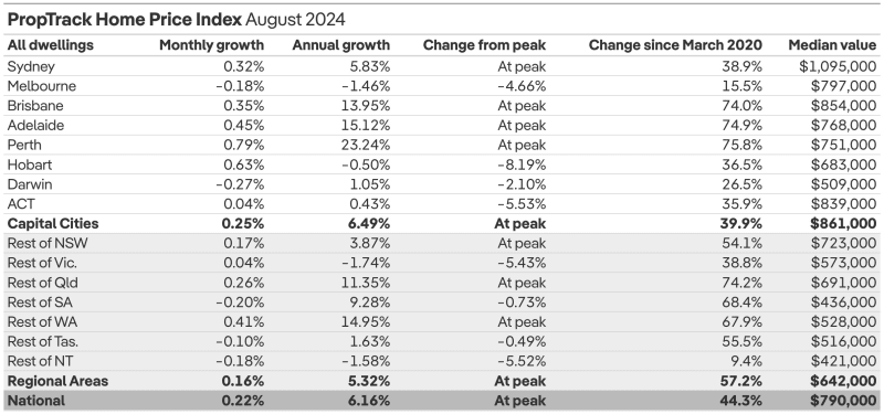 根据最新的PropTrack房价指数,8月份全国房价中值环比仅上涨0.22%至790,000澳元。