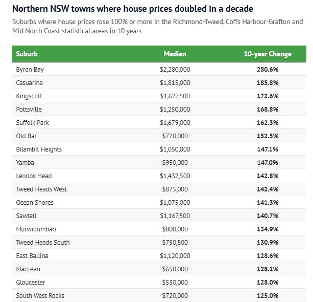 过去十年,由于购房者追求更为悠闲的沿海生活方式,新南威尔士州北部一系列郊区的房价上涨了一倍或近三倍。