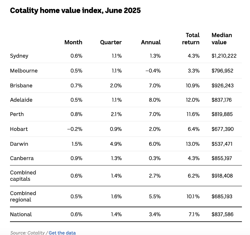随着利率下降提振市场信心,6月澳洲房价再创新高。房产研究公司Cotality的最新房屋价值指数显示,自夏季房价下跌0.3%后,房价连续五个月上涨,全国住宅价值上涨0.6%。