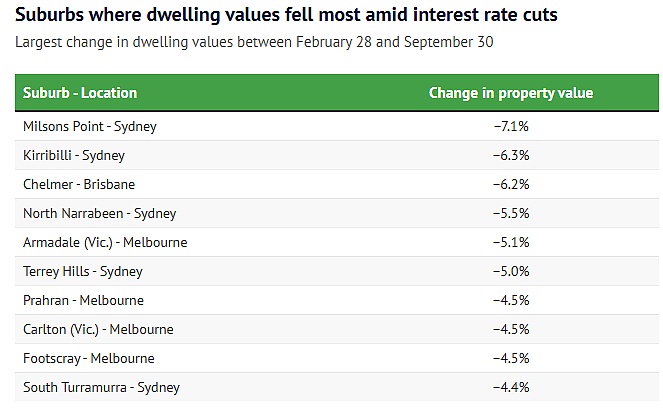 在全国房价跌幅最大的十个城区中,除了一个之外,其余都位于悉尼或墨尔本。