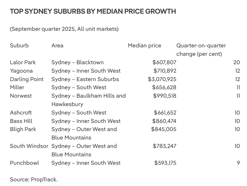 数据显示,7月至9月期间,季度增长率排名前15位的郊区市场均为公寓市场。这些郊区主要集中在悉尼的西南部、内西南部及外西部地区,反映出越来越多的购房者因追求可负担性而选择离开悉尼City。