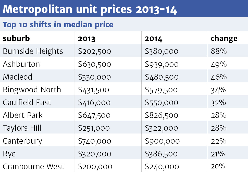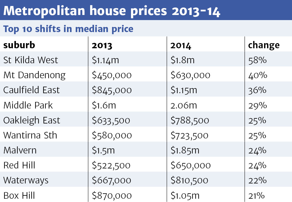 从报告上看来,2014年维州房价上涨速度最快的区域是St Kilda West区。该区的房产销售量较少,但是中位房价从2013年的114万澳元上涨到2014年的180万澳元,涨幅达58%。