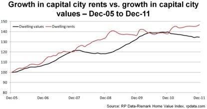 下面的图表数据来自于RP Data,它表明在过去的6年里,省会城市的房价增长了34.5%,而租金增长了46.8%。