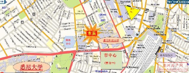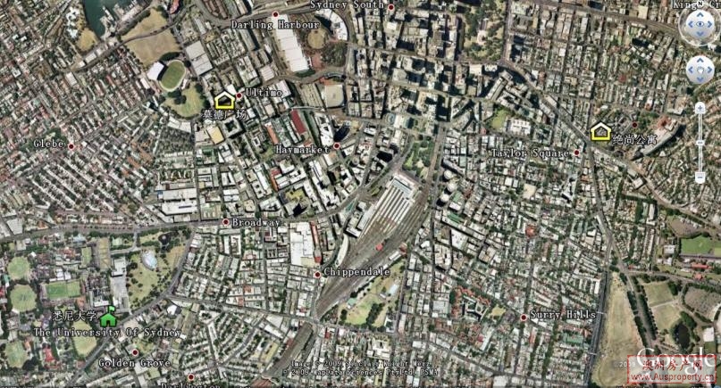 悉尼大学与物业位置图:(以上为GOOGLE地球截图,位置与距离距离实际较近)