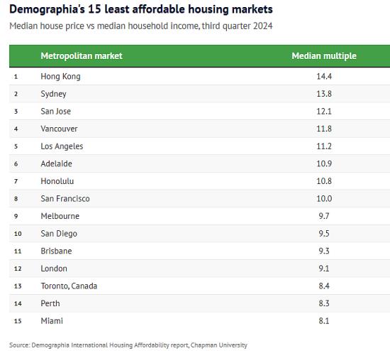 报告指出,香港是房价最无法负担的城市,悉尼排名第二,阿德莱德和墨尔本分别位居第6和第9,珀斯第14。
