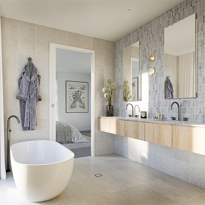 豪华浴室为您提供远离日常喧嚣的宁静休憩之所。在这里,设计师设计的青铜配件与大理石和马赛克特色墙相得益彰,提供类似水疗的体验。宽敞的独立式浴缸和凹槽玻璃淋浴屏为主卧套间增色不少。