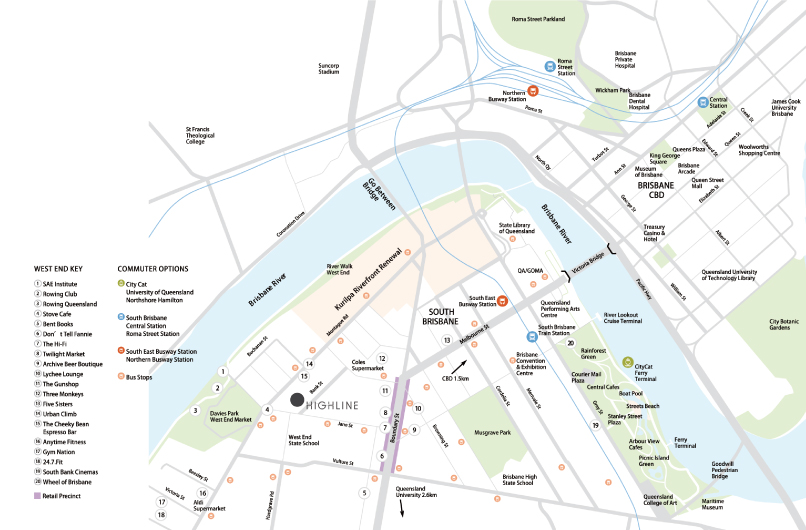 从Highline到市中心可以选择乘坐轮渡和公交车。教育方面,步行即可以达到布里斯班州立高中,区域南面隔河相望即是昆士兰大学总校区,向北即是昆士兰科技大学。