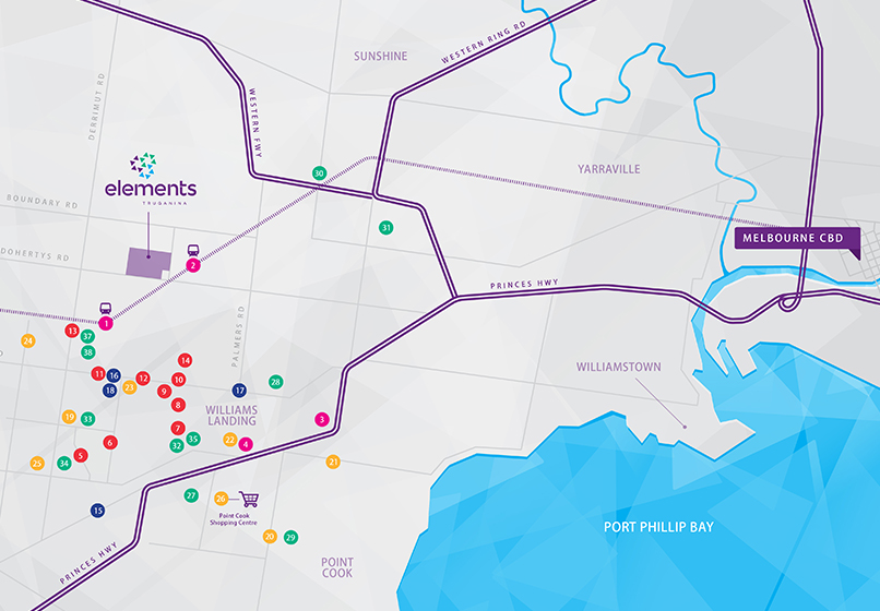 Elements占据Truganina绝佳地理位置,地处易于通向Princess 和Western 高速路快速入口,距离社区100米规划了未来的Truganina火车站,距离目前最近的Tarneit火车站也仅1.4公里,交通非常便利。10分钟车程前往Point Cook,为你提供一流的餐饮和娱乐选择, 15分钟车程到Werribee医院和Werribee广场,包括电影院。