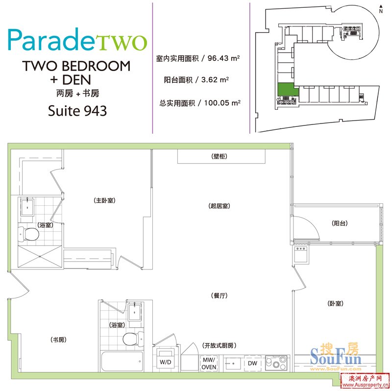 柏离豪宅Parade suite943 户型图 2室1厅1厨2卫