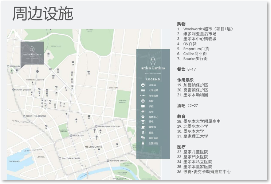 项目还位于被墨尔本最佳公立高中墨尔本大学附中(The University High School)学区内,毗邻墨尔本大学及皇家理工大学(距离2.7km),北墨尔本小学(距离1.1公里)也在众多小学中享有盛誉。Arden Garden可谓是理想教育住宅中心。
