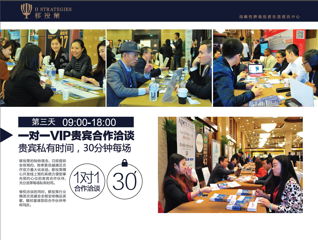 第三天所有和中介谈合作的方式都是通过我们在线预约系统提前安排好,您可以寻找您最合适的项目或中介,现场会以预约好的行程进行洽谈。