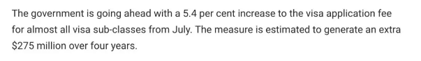 签证上调之后,在新财政年中,将会为政府创收2.75亿澳币。