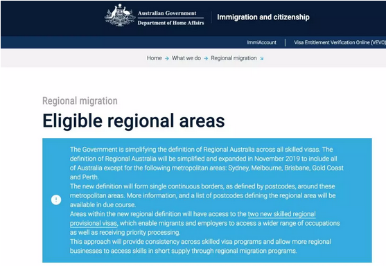 澳移民局重新定义了偏远地区(regional area),从2019年11月起,悉尼,墨尔本,布里斯班,黄金海岸,珀斯之外的地方,都属于regional area。