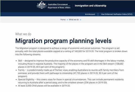 2019年3月20日,澳洲移民局公布了2019-2020年的移民上限为160,000人次。移民配额从190,000人缩减了整整30,000人。