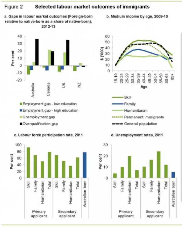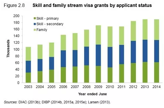 William Bourke所提议的与生产力委员会的观点不谋而合。生产力委员会曾在Migrant Intake into Australia中说到,技术移民中,大约一半的签证都发给了副申。所以相比家庭团聚类移民,技术移民数量看似很多,占到总数量的将近70%,但是技术移民副申加上家庭团聚类移民之后,两者的总数量反而占到了整个移民计划的70%!