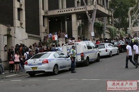 在位于莫瑞迪安国际教育集团旗下的悉尼校区,听说学校倒闭的学生们聚焦在一起,警察也赶来维持学校秩序。 [数据图片]