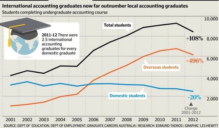 《澳洲金融报》对大学课程数据进行分析后发现,2001年至2012年,本科会计专业毕业的留学生人数狂飙了500%,同期相比本土毕业生人数却降低了。截至2012年,会计专业的留学毕业生和本地毕业生比例为2.5:1。