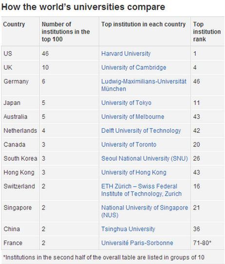 在前100名中美国有46所大学入榜,英国有10所,德国有6所大学,日报和澳洲同样有5所。墨尔本大学是澳洲排名最靠前的大学,但也从2013年的第39位下降到了第43位。