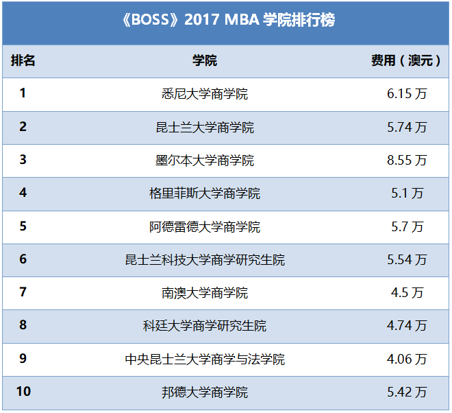 在高级管理人员MBA课程排名中,昆士兰科技大学商学研究生院位居榜首,其次到墨尔本商学院,而悉尼大学商学院排名第三。