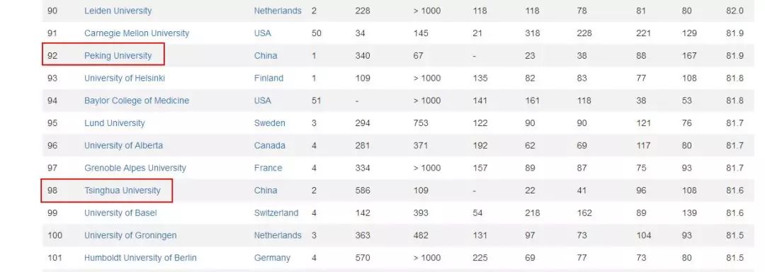 北大和清华都进了前100,分别位居第92和98名。