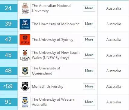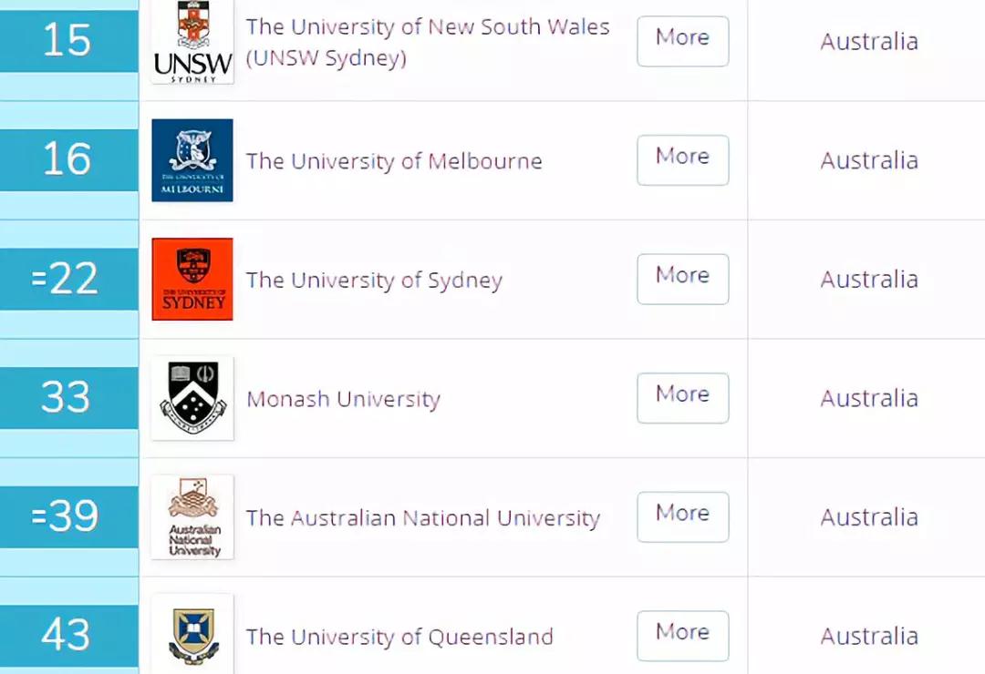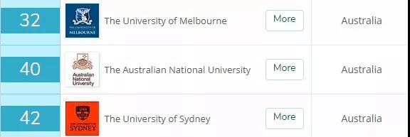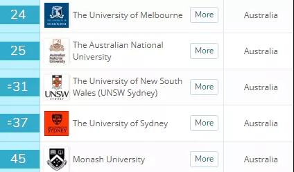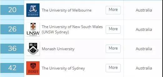很可惜,没有澳洲大学进入前50,但是莫纳什、墨大、新南威尔士、悉尼大学挤进了前100。