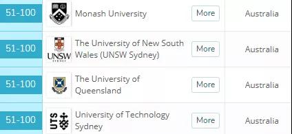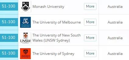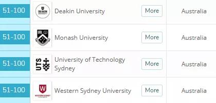 位列50-100位之间的有这些澳洲大学:迪肯大学、莫纳什大学、悉尼科技大学、西悉尼大学。