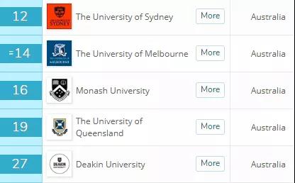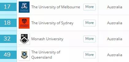 悉尼大世界排名第12,差点挤进世界前10,其他进入世界前50的有,墨尔本大学(14)、莫纳什大学(16)、昆士兰大学(19)、迪肯大学(27)。