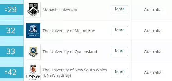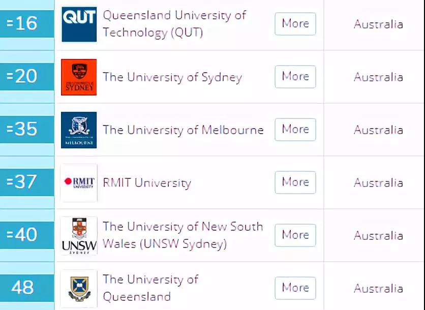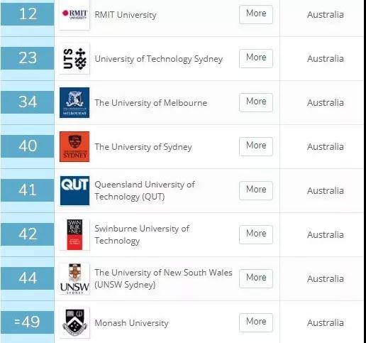 进入前50的大学有昆士兰科技大学(16),悉尼大学(20),墨尔本大学(35),RMIT大学(37),南威尔士大学(40),昆士兰大学(48)。