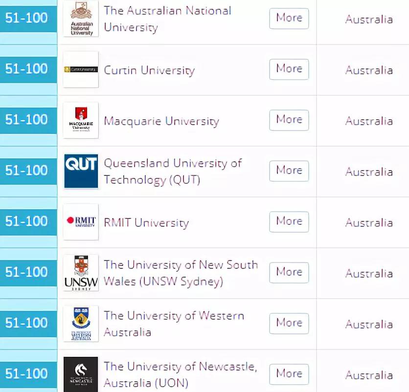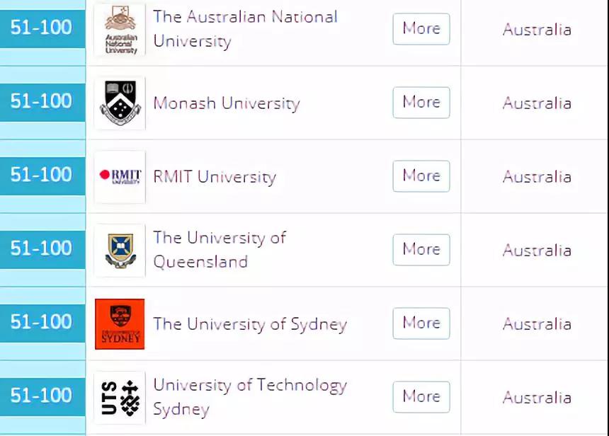 排名50-100之间的有,澳洲国立大学,莫纳什大学,RMIT大学,昆士兰大学,悉尼大学,悉尼技术大学。