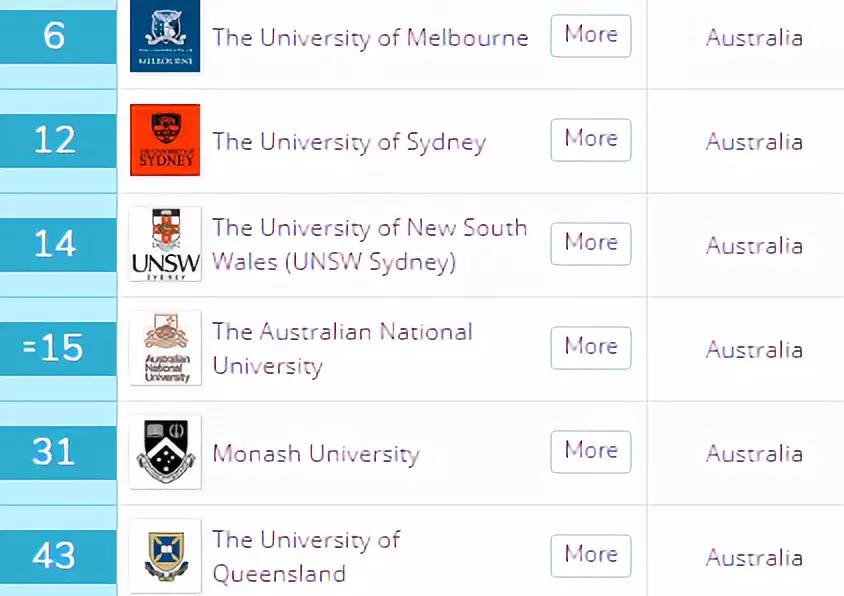 其他挤进前50的大学有悉尼大学(12)、南威尔士大学(14)、澳国立大学(15)、莫纳什大学(31)、昆士兰大学(43)。