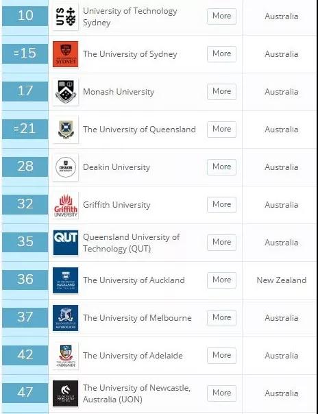 10所大学挤进前50,分别是悉尼科技大学(10),悉尼大学(15)、莫纳什大学(17)、昆士兰大学(21)、迪肯大学(28)、格里菲斯大学(32)、昆士兰科技大学(35)、墨儿本大学(37)、阿德莱德大学(42)、纽卡斯尔大学(47).