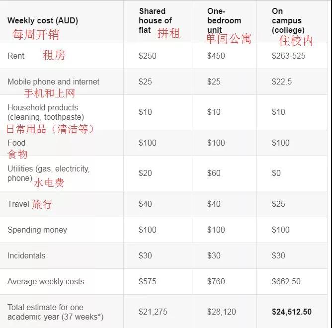 注意:以上费用只是大概数据,具体的要根据你的生活方式决定;37周是每学年的时间,不包括从12月到2月的暑假10个周;