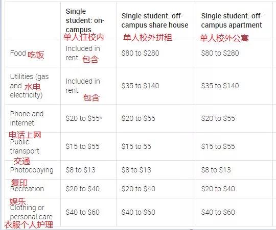 以上费用只是学生单人费用的大概数据,不包括学费,课本费用,其他与学习相关费用,也不包括买车,医疗费用,或者奢侈品费用;