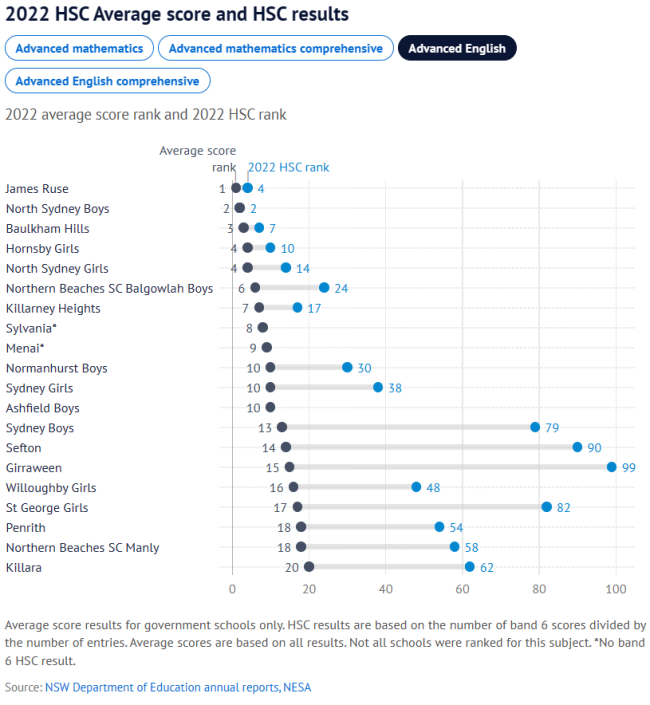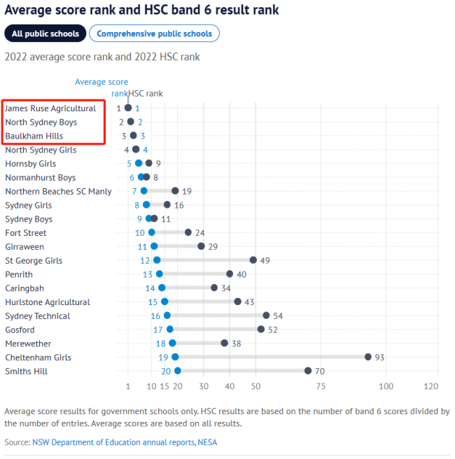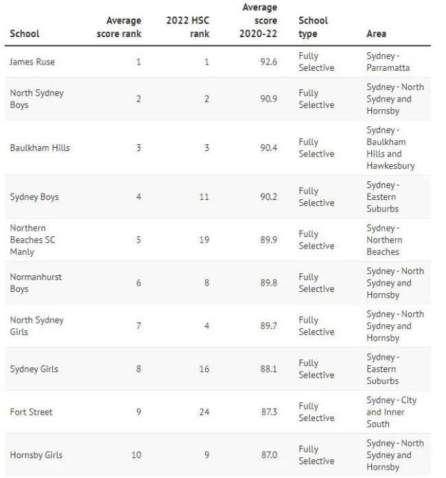 其中,在过去的三年里,James Ruse Agricultural High、North Sydney Boys'、Baulkham Hills High名列前茅。
