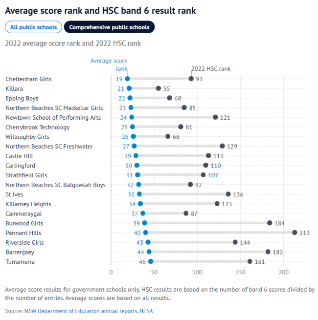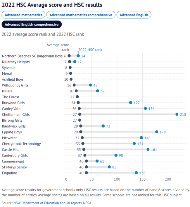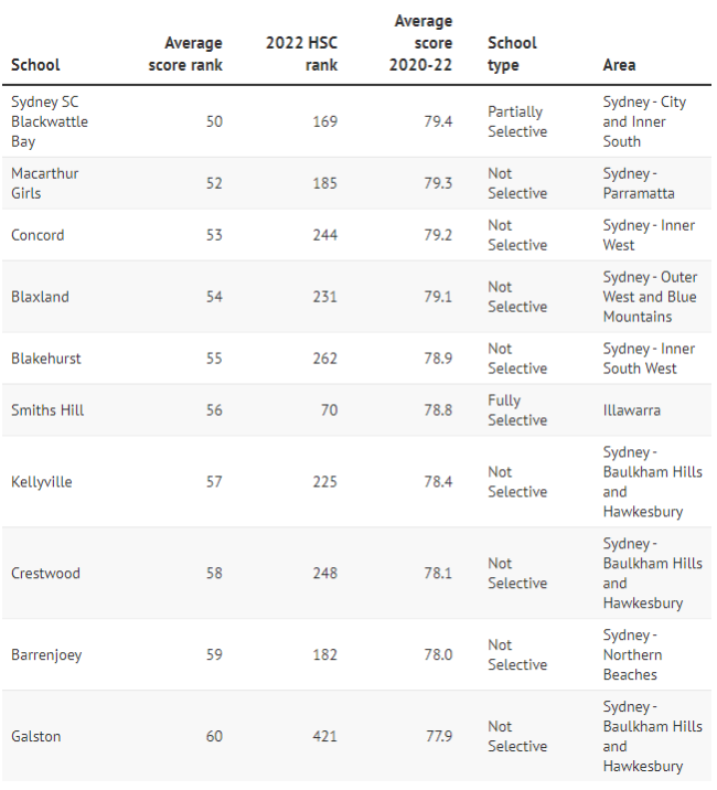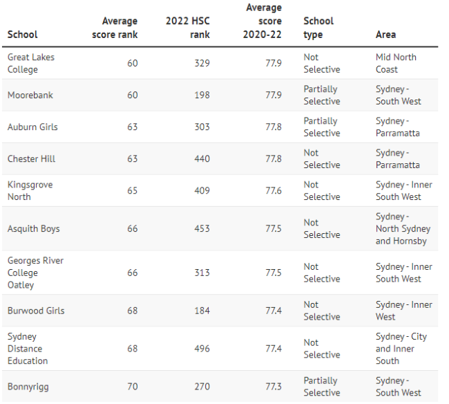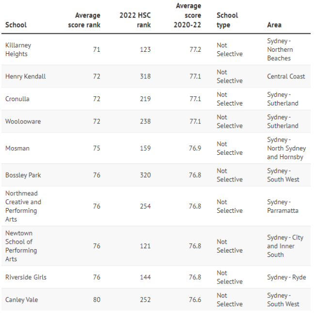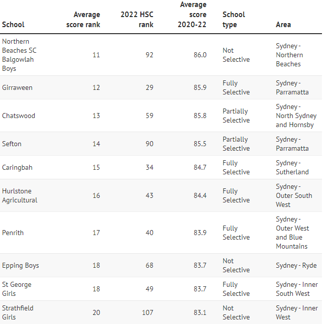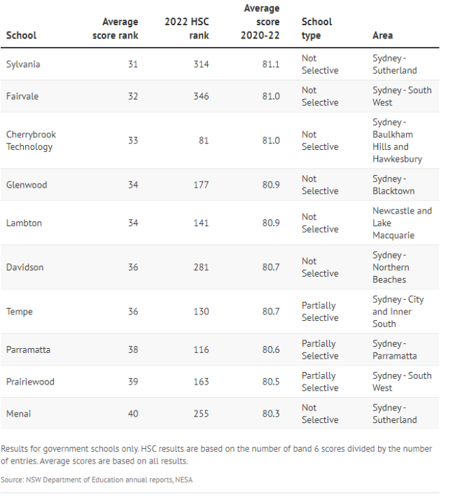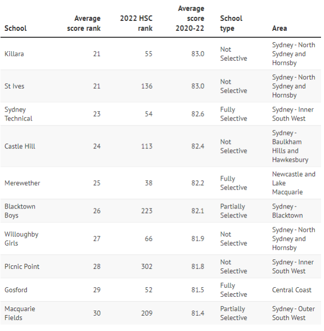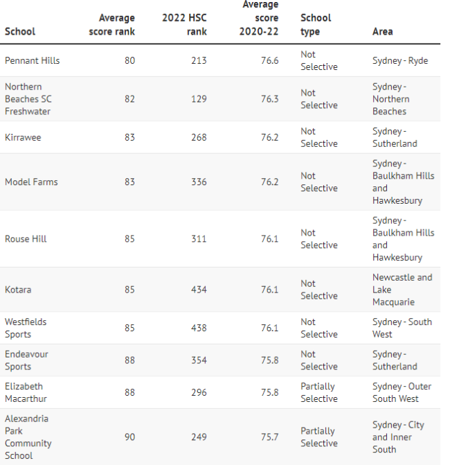 而普通公校Cheltenham Girls、Killara High、Epping Boys、 Willoughby Girls、Carlingford、Castle Hill High的平均分排名也都显著上升,进入前30名,平均分超过80分。