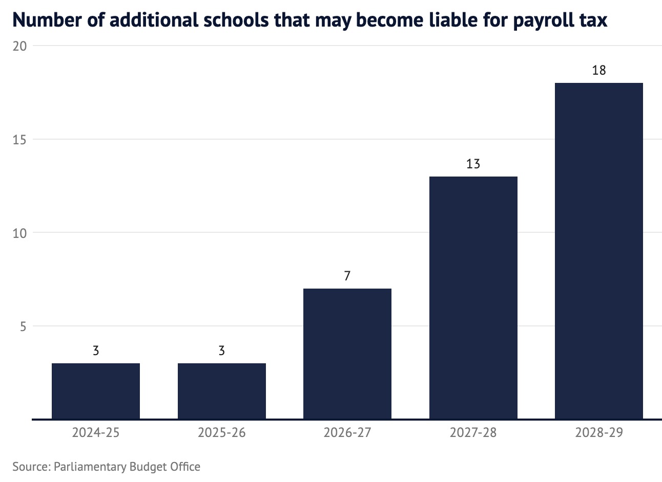 最初选中支付税收的是60所独立学校和天主教学校,但政府在8月再次改变主意,调整规则,以便任何超过门槛的学校都将受到徵税的影响。PBO表示,这一决定尚未在任何文件中正式确定,尚不清楚明年将有多少学校支付这税。