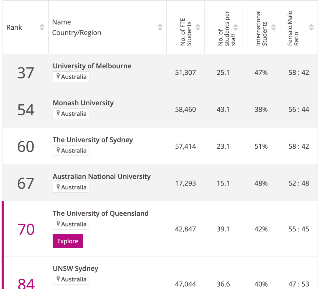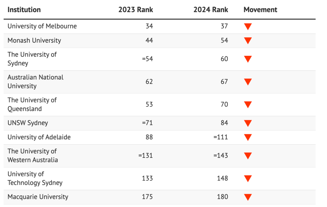 另外,还有澳洲国立大学(排名62位)、昆士兰大学(排名70位)、和新南威尔士大学(排名84位),分别下降了5位、17位和13位。