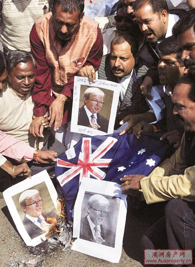 印度反对派焚烧澳洲总理陆克文的照片,以抗议印度学生在澳遭到种族仇杀。
