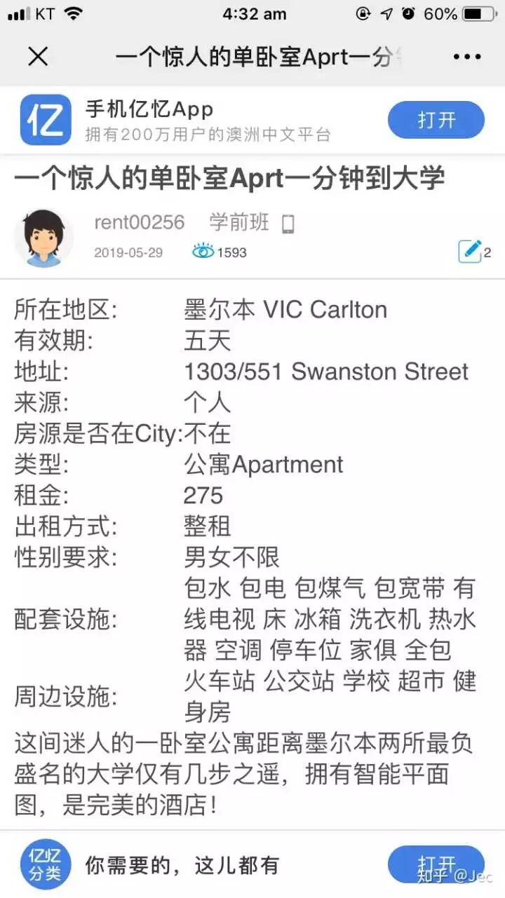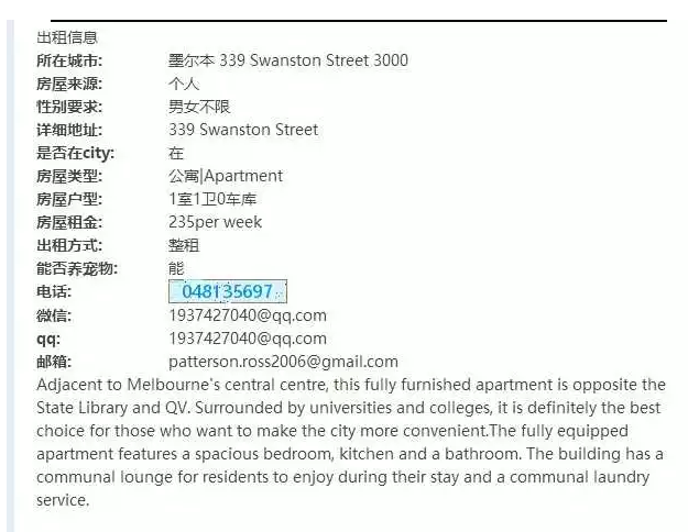 相比之前的广告,还是一如既往的精美装修和单调的用户名称rent00256,还是熟悉的qq+邮箱联系方式,方便骗财得手后闪人。为什么说这次升级了呢?因为价格从235$-->变动到了275$ 提高了40$ 每周,看起来更加合理。也列出了具体地址1303/551 swanston street. 同时还给出了公司的名称。