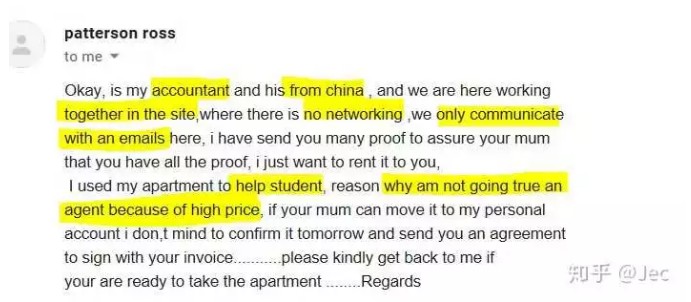 Patterson, 项目经理,从事土木工程,人在新西兰,公司赢了投标,要在NZ 呆2-3 年,租金不是问题,主要想找个爱护房子爱干净的租客。看起来好像很合理很Aussi,就像给钱白不要一样。