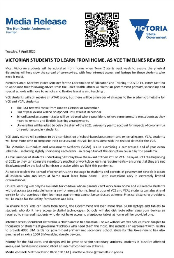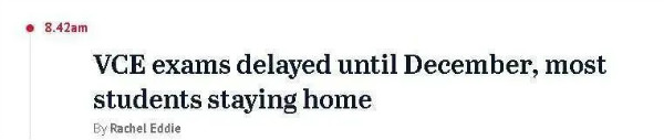 上周(4月7日),维州州长官宣表示,今年的维州高考延期至12月进行。