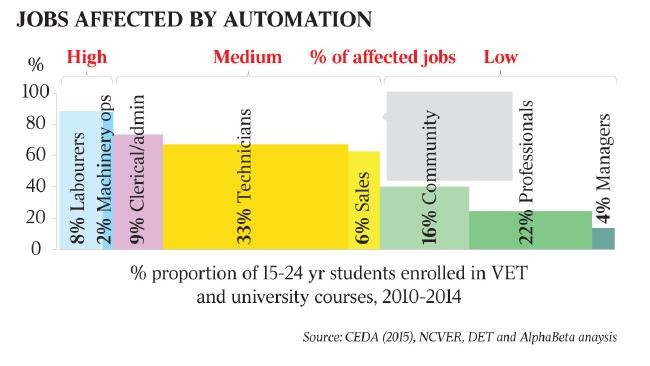 报告还指出,澳洲15-24岁的青年人将会在未来职业生涯中,不同程度上受到自动化、全球化的影响,而受到冲击最大的就是那些低技能劳动、零售业和行政工作。
