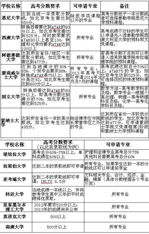 澳大利亚国立大学则是将中国的高考分数折算成澳洲的ATAR 成绩,再对照相关本科专业的入学要求。不同的专业要求可能会有所差别,但都是ATAR80分以上,即高考分数达到满分的70%。例如,2013年北京地区的学生,需要高考成绩达到525分。若高考分数低于这一要求,则可以选择澳洲国立大学的预科课程。