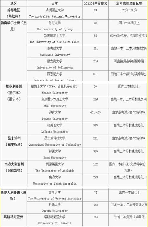 只要学生的高考成绩能够达到当年一本线以上,就可以用高考成绩申请悉尼大学、澳大利亚国立大学、新南威尔士大学、莫纳什大学等世界一流名校。